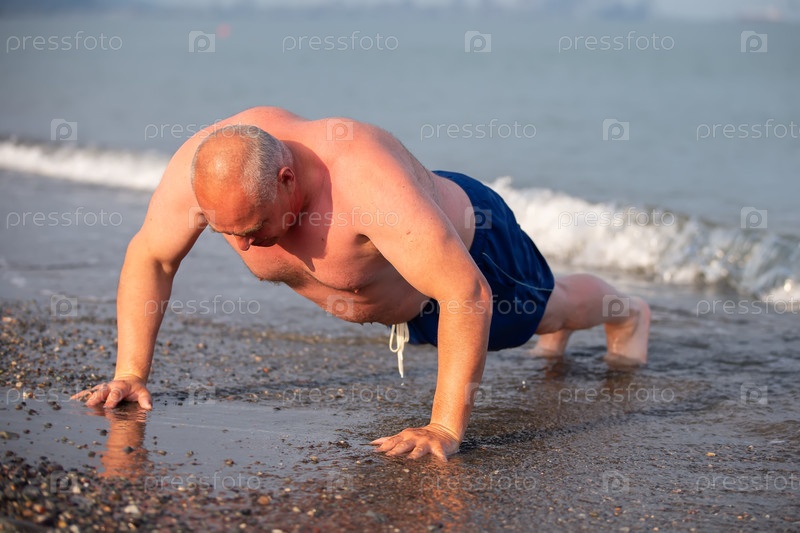 Пожилой мужчина спортивного телосложения занимается спортом на берегу. Зрелый мужчина отжимается на открытом воздухе