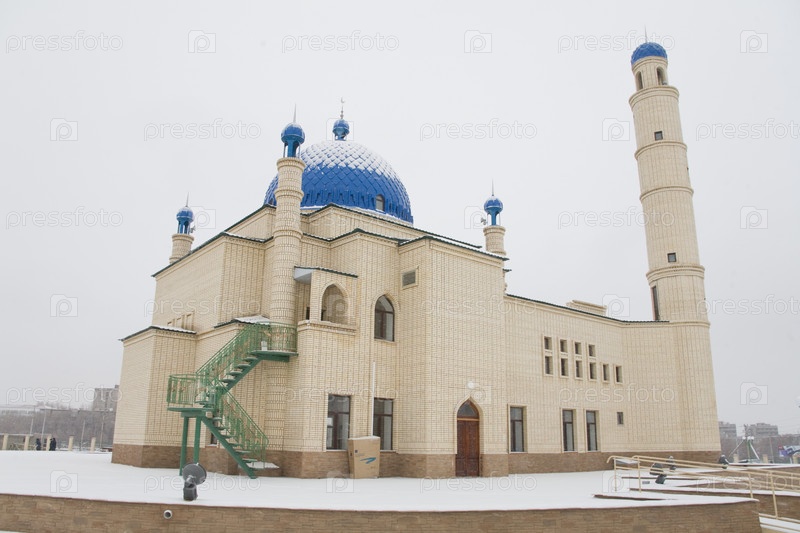Красивая мусульманская мечеть в синем небе и траве. Высококачественное фото