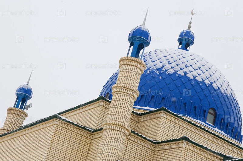 Красивая мусульманская мечеть в синем небе и траве. Высококачественное фото