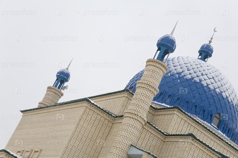 Красивая мусульманская мечеть в синем небе и траве. Высококачественное фото