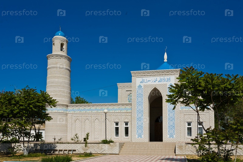 Красивая мусульманская мечеть на фоне голубого неба и травы