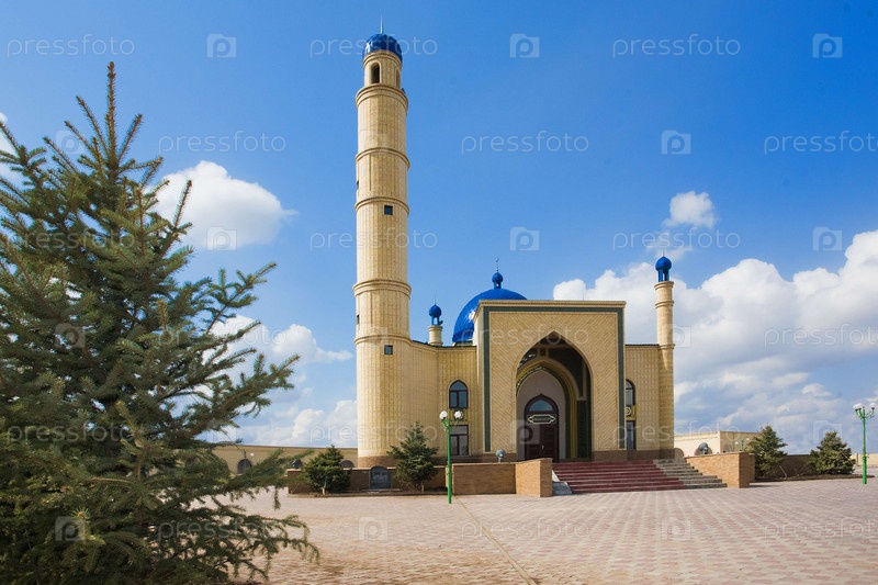Красивая мусульманская мечеть на фоне голубого неба и травы