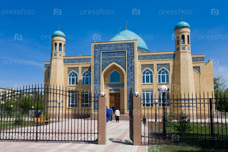 Красивая мусульманская мечеть в синем небе и траве. Высококачественное фото