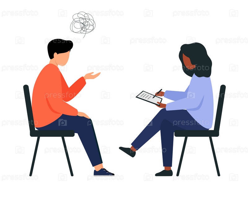 Люди разговаривают, сидя напротив друг друга. Женщина слушает мужчину и ведет записи. Прием у психолога