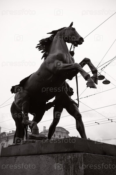 Скульптурный элемент Укрощение коня человеком, Аничков мост, черно-белое фото - Санкт-Петербург, Россия, Июль 2016