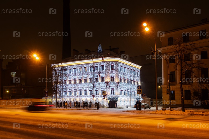 Здание, украшенное светящимися гирляндами и фигурами Санта Клаусов, забирающихся наверх. Отель Glinz Hotel - Санкт-Петербург, Россия, Декабрь 2023