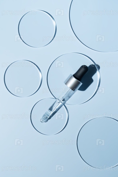 Косметическая пипетка с маслом на синем фоне крупным планом. Стильная концепция органических эссенций, товаров для красоты и здоровья. Современная аптека. Крупным планом