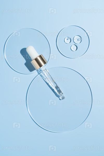 Пипетка и капли и мазки косметики. Жидкий гель из золота 24 карата или капля сыворотки на синем фоне в лабораторном стекле. Исследования по уходу за кожей