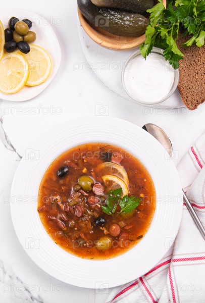 Солянка сборная в белой тарелке на белом столе