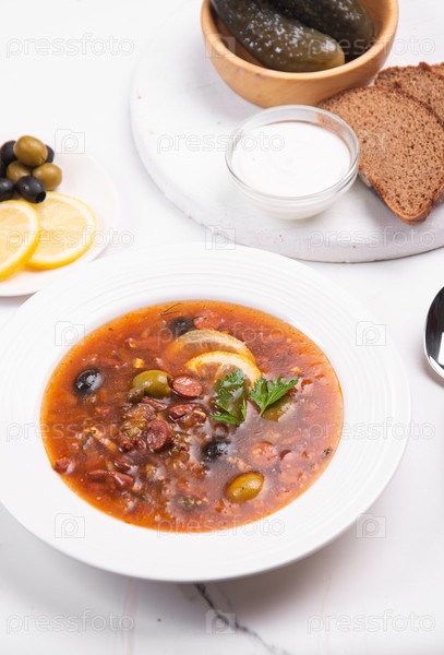 Солянка сборная в белой тарелке на белом столе