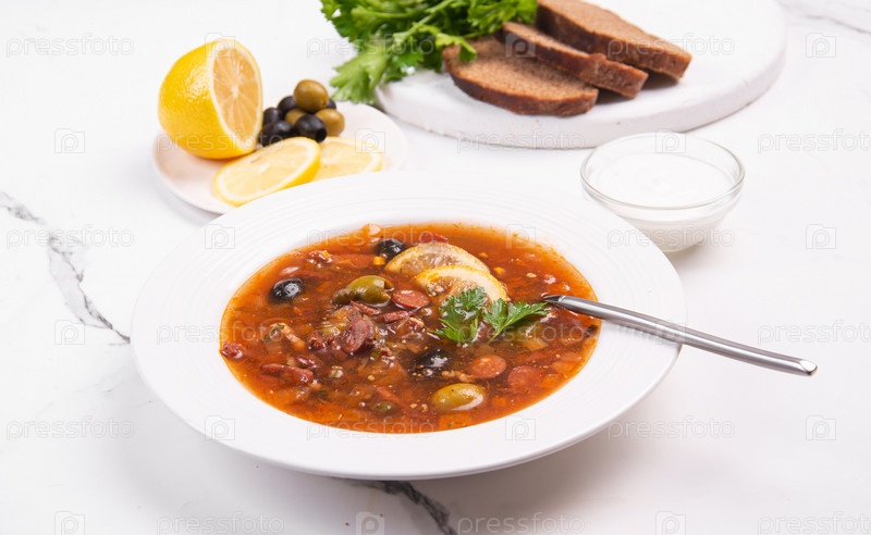 Солянка сборная в белой тарелке на белом столе