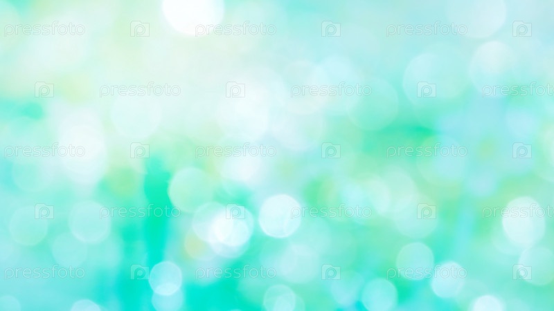 Размытый весенний летний абстрактный фон с боке-огнями. Естественный размытый утренний пейзаж с расфокусированными солнечными огнями на сине-зеленом фоне