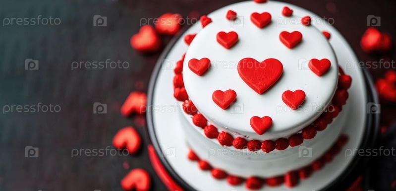 Торт украшен красными сердечками для романтического вечера. Баннер для выпечки бенто или кондитерских изделий
