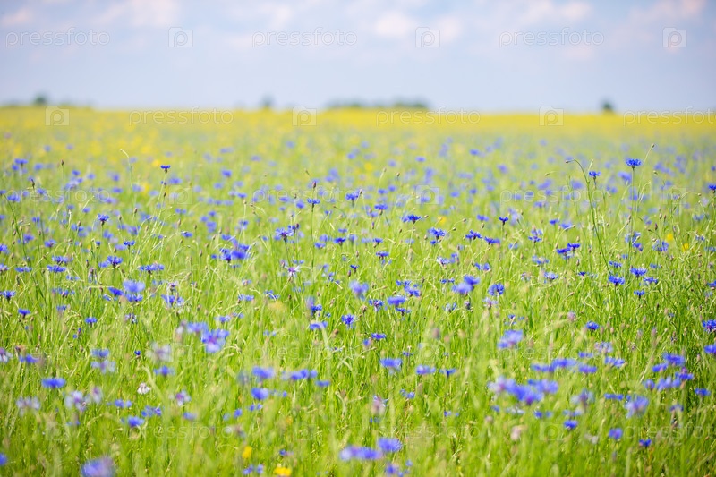 Васильковое поле с зеленой травой и голубым небом. Естественный природный фон