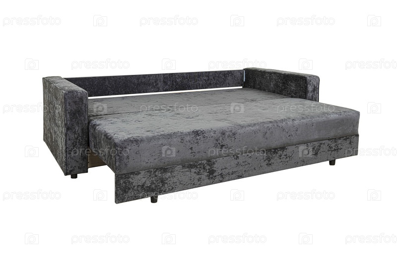 Серый разложенный диван с подушками из велюровой ткани, изолированными на белом фоне. Мягкая мебель
