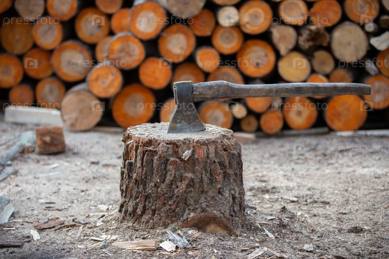 Топор дровосека на фоне наколотых дров