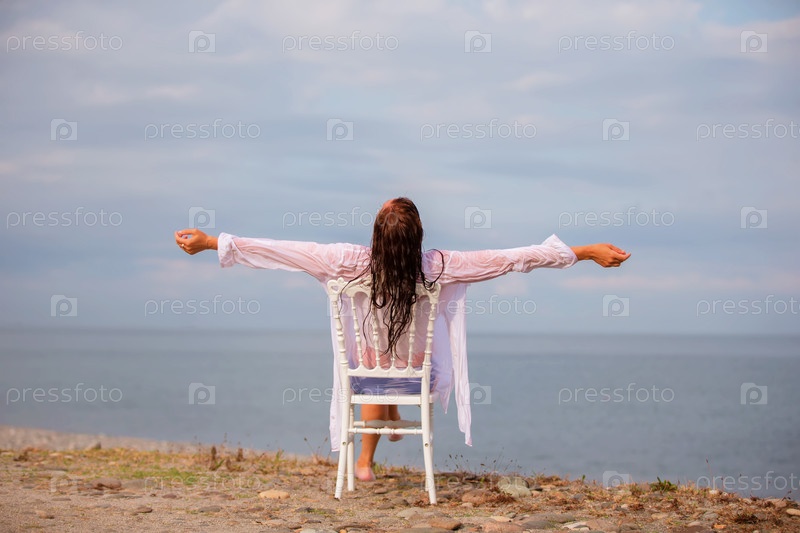 Женщина сидит на стуле у океана, вытянув руки