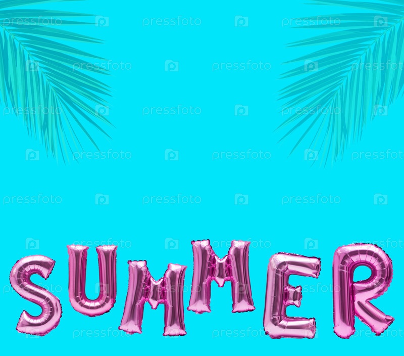 Синий фон с розовыми буквами, составляющими слово 'лето'.Розовые буквы сделаны из фольги и расположены таким образом, что они выглядят как пальмовые листья