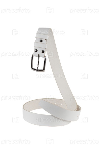 Белый кожаный ремень с металлической пряжкой красиво изогнут и выделяется на белом фоне