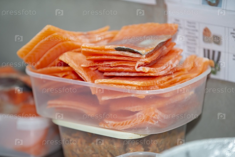 Нарезанные кусочки красной рыбы для приготовления суши