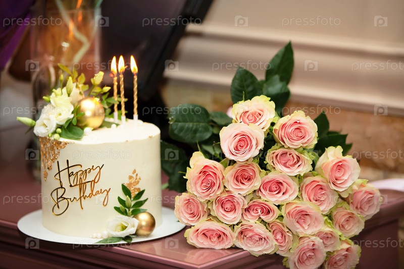 Торт с надписью С Днем Рождения и букет розовых роз на столе. Подготовка к юбилею