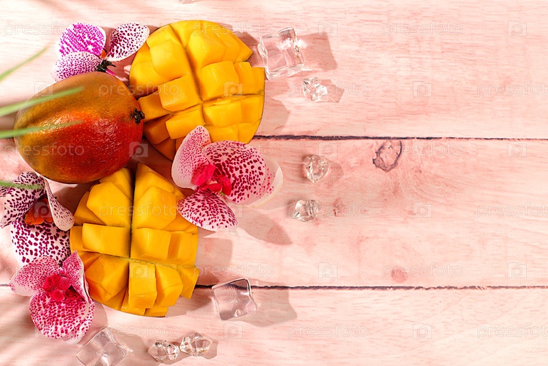 Экзотический фрукт манго на солнечном столе с тенями от пальмы и цветов орхидеи, рекламная карточка магазина. Летний баннер с тропическими фруктами. Здоровая веганская еда для похудения
