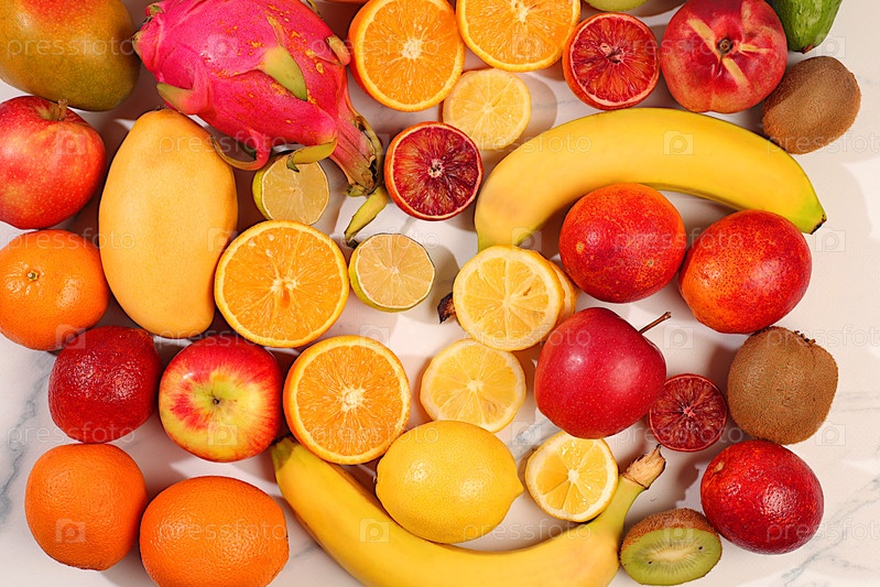 Баннер с тропическими экзотическими фруктами на бетонном фоне, летние каникулы и концепция здорового образа жизни. Рекламная карточка для рынка или магазина. Здоровая веганская еда для похудения