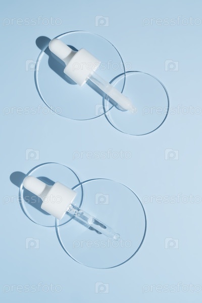 Косметическая сыворотка пипетки на чашке Петри на синем фоне. Концепция косметологии и фармацевтики. Кислотный пилинг, масло для лица, коллаген