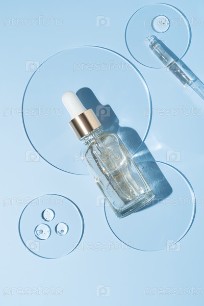 Исследования в области ухода за кожей. Косметическое производство, извлечение компонентов из хлопьев 24 карата золота. Косметологическое тестирование ухода за кожей. Чашка Петри с капельницей на синем фоне