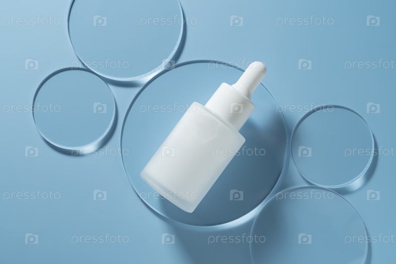 Сыворотка с пипеткой в чашке Петри на синем фоне. Вид сверху, плоская планировка. Дерматологическая научная косметическая лаборатория. Натуральная медицина, косметические исследования, органические средства по уходу за кожей