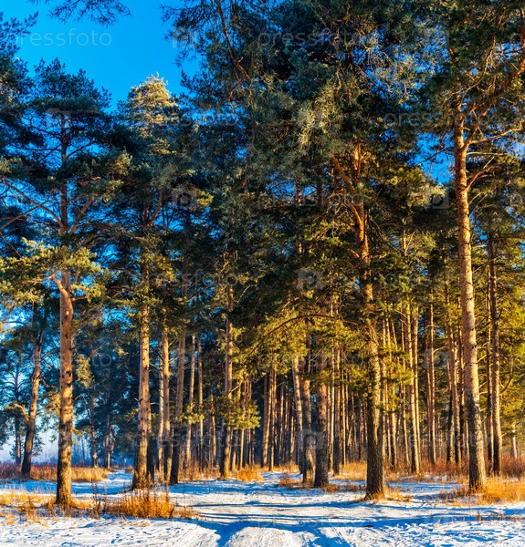 Дорога в сосновом лесу в морозный и солнечный зимний день
