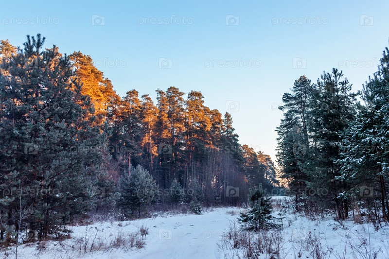Сосны на морозном зимнем утре на рассвете