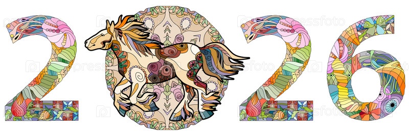 Стилизованное в стиле зентангл число 2026 с лошадью. Векторная иллюстрация кружева ручной работы