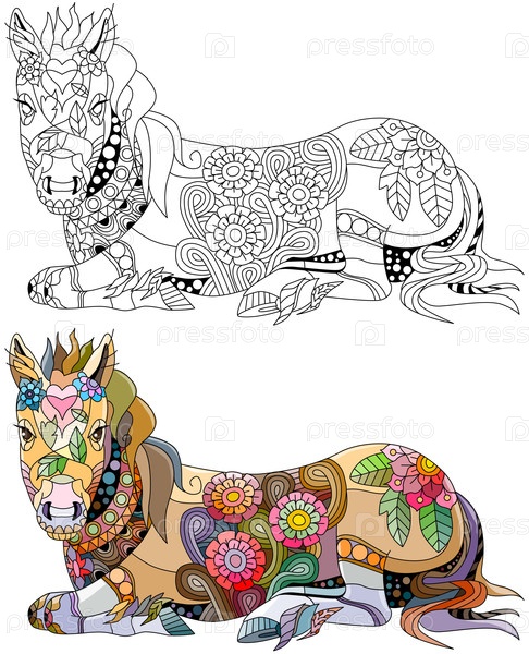 Zentangle лежащая лошадь. Нарисованная вручную декоративная векторная иллюстрация для раскрашивания. Набор цветов и контуров