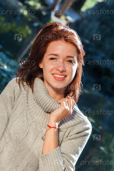 Милая девушка в свитере на фоне озера