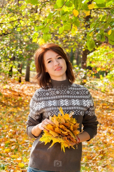 Симпатичная девушка в джинсах и свитере в осенней листве