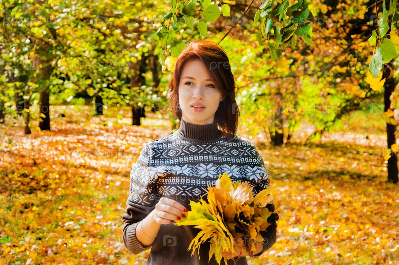 Симпатичная девушка в джинсах и свитере в осенней листве