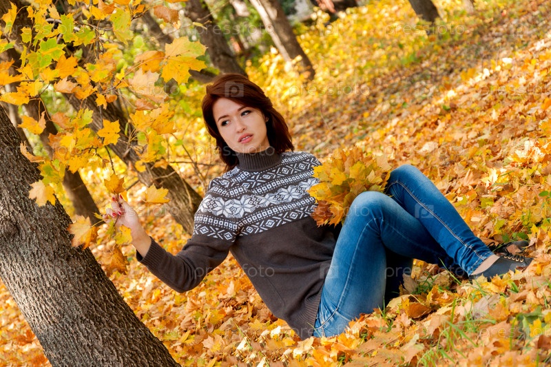 Симпатичная девушка в джинсах и свитере в осенней листве