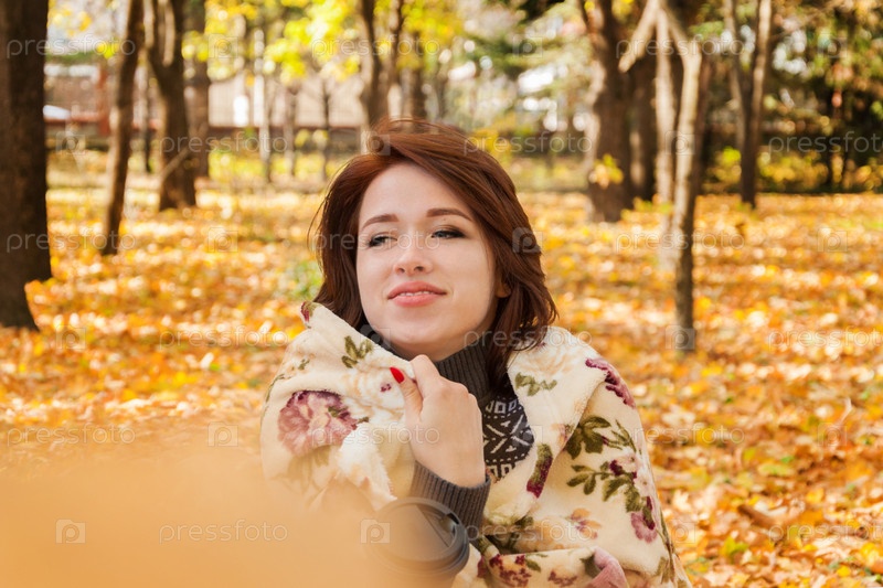 Симпатичная девушка в джинсах и свитере в осенней листве