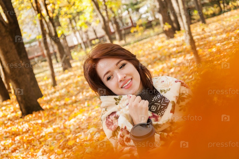 Симпатичная девушка в джинсах и свитере в осенней листве
