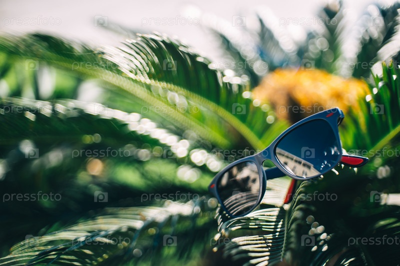 Синие солнцезащитные очки на пальмовых листьях на солнце