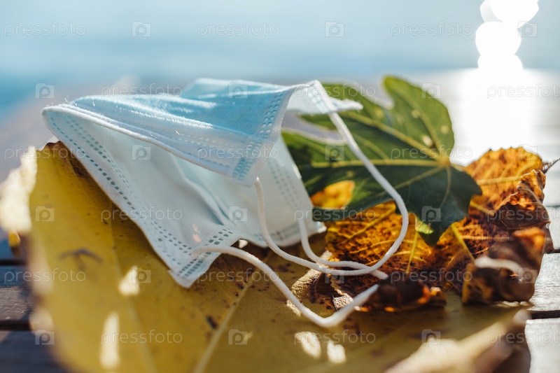 Медицинская маска лежит на желтых осенних листьях ковид