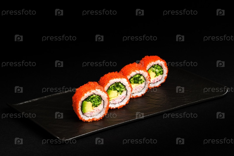 Вкусные свежие суши-роллы из лосося, изысканно представленные на черном фоне