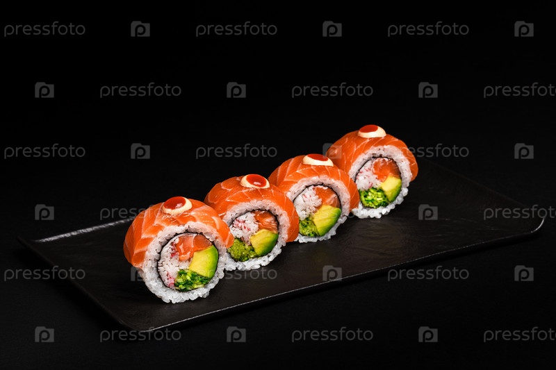 Вкусные свежие суши-роллы из лосося, изысканно представленные на черном фоне