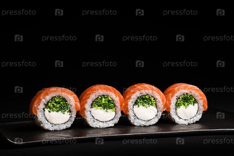 Вкусные свежие суши-роллы из лосося, изысканно представленные на черном фоне