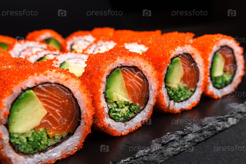Вкусный свежий набор суши и роллов, изысканно представленный на черном фоне