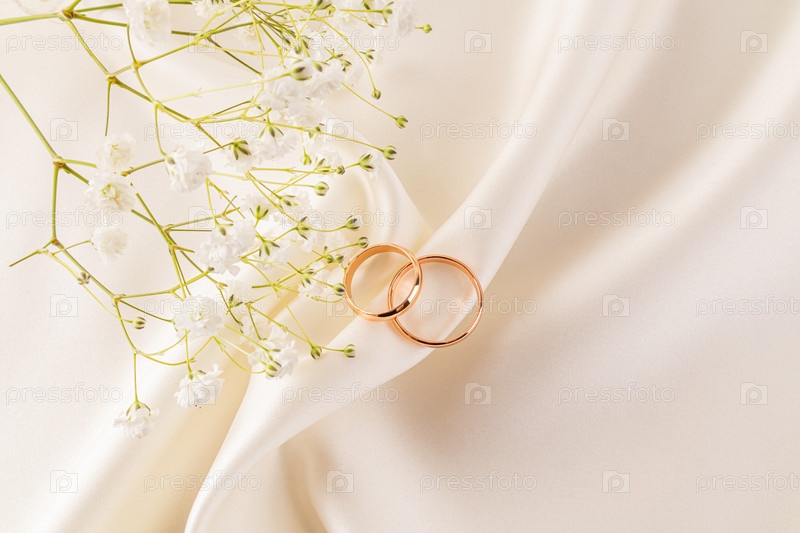 Два золотых обручальных кольца лежат на красивой складке кремового атласа. Нежные цветы гипсофилы. Вид сверху. Концепция свадьбы