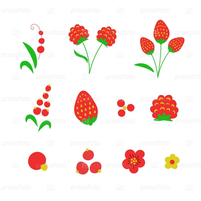 Клубника, малина и смородина. Набор ягод, цветов и листьев