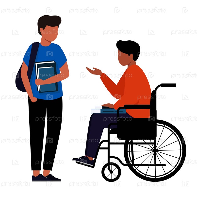 Инвалид в инвалидной коляске держит книги на коленях и разговаривает с парнем. Студент с ограниченными возможностями. Иллюстрация на белом фоне