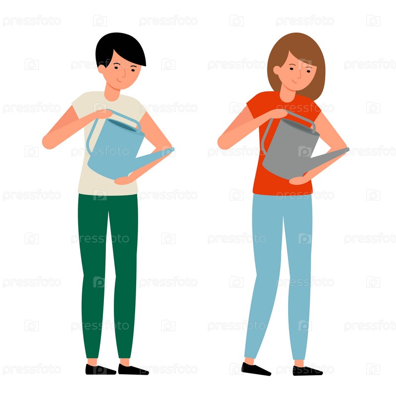 Парень и девушка держат лейку. Молодые люди поливают. Иллюстрация на белом фоне